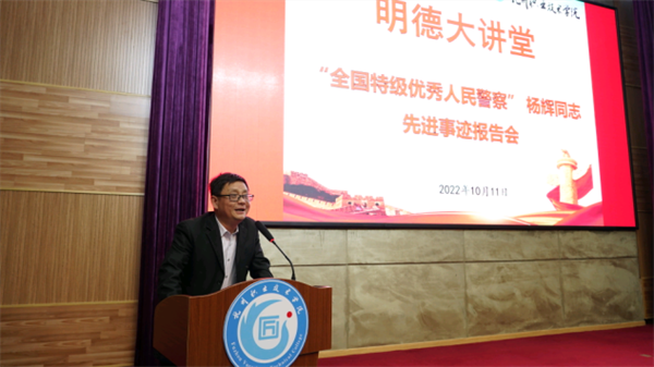 “用我将无我、不负人民的壮志情怀,去为今天尽力、为历史尽责、为党和人民尽忠!”铿锵有力的誓言回荡在抚州职业技术学院明德大讲堂内,现场爆发出阵阵掌声。10月11日下午,全国特级优秀人民警察杨辉先进事迹宣讲团走进学院开展宣讲,160余名大学生骨干和宣传工作站学生代表在此接受先进事迹熏陶。